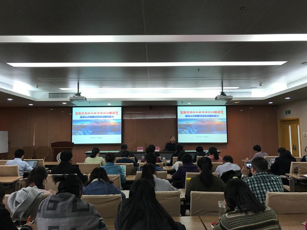 郑教授从习近平总书记在全国高校思想政治工作会议上的重要讲话切入,介绍了思想政治教育前沿问题的概念、特点、作用及存在的原因,提出要加强意识形态工作理论研究、理想信念教育理论研究、文化自信理论研究等前沿理论问题研究。第一,思想政治教育与意识形态工作的理论研究。思想政治教育实质上就是意识形态工作,高校要把握意识形态领导权,加强学生思想政治教育是重中之重。第二,理想信念教育的时代性与逻辑性特点研究。要看到理想信念本身的层次性,尤其要把握理想信念形成的理论逻辑及其规律。第三,文化自信与思想政治教育价值认同理论研究。文化自信是思想政治教育认同的基础、是提升国家软实力和个人动力的关键,要努力用中华民族创造的一切精神财富来以文化人、以文育人。最后,郑教授从实践着眼,提出解决现实问题,一要坚持一元主导与多样发展的辩证。二要坚持外在压力与内在动力的转化。三要坚持信息获取与信息整合的结合。