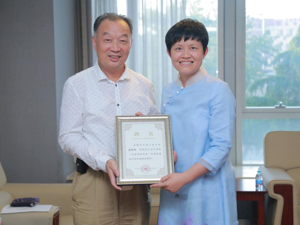 授课前,我校校长助理朱凌云热情会见了温铁军教授,与其就大学生读书读经典、人文素质培养、中国当前农村发展现状等问题进行了深入交流,并代表课程组为温铁军教授颁发了“名家领读经典”课程授课教师聘书。