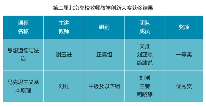 近日,北京市教育委员会公布了第二届北京高校教师教学创新大赛获奖结果名单。必赢官网两支参赛团队全部获奖,谢玉进教授为主讲教师的“思想道德与法治”教学团队获得第二届北京高校教师教学创新大赛正高组一等奖,刘礼老师作为主讲教师的“马克思主义基本原理”教学团队获得优秀奖。谢玉进教授团队将代表学校和北京市参加中国高等教育学会7月底在西安交通大学举办的全国高校教师教学创新大赛。